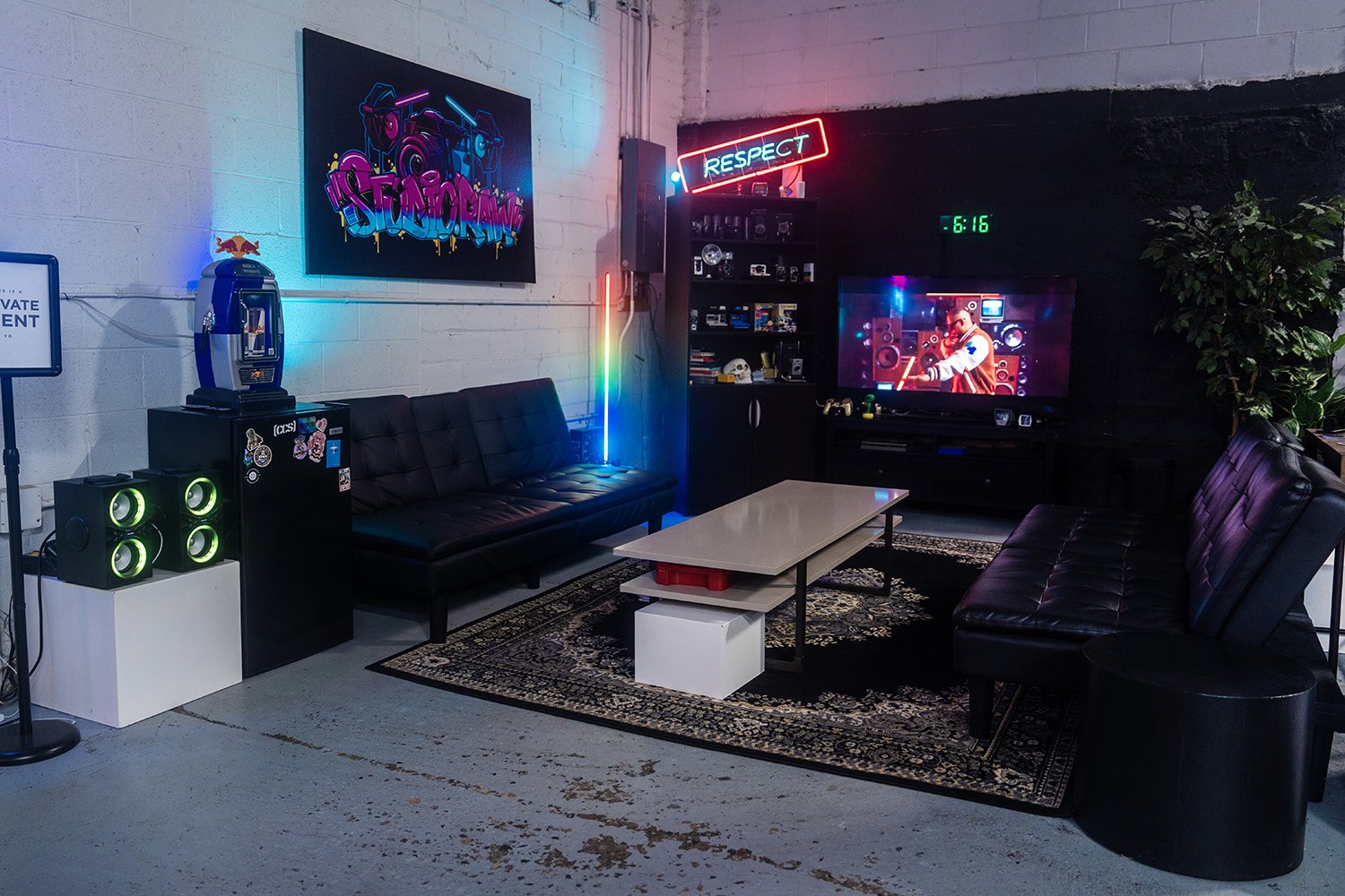 We have a spacious and comfortable space that offers infinite creativity. This space includes everything you need to capture your dream shoot, including but not limited to; 9' paper backdrop room with optional lighting and accessories, vanity/changing room with props and storage, 8ftx8ft Speaker / TV wall (2 larger TVs have HDMI input), large grafitti wall, vintage Pepsi machine with neon, 15ftx8ft overhead hex light, lounge area with fridge and much much more! This space has standing sets that change out frequently (may vary). Check out the Peerspace listing below for full up to date info!